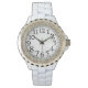 Ultra vrouwelijk polshorloge, met een witte band, en een wijzerplaat met steentjes. De stijl van dit horloge kan worden gewijzigd om aan uw behoeften te voldoen. De achtergrond van dit horloge heeft grote nummers, wat een doorzichtig afbeelding is, waardoor je je eigen afbeelding naar de achtergrond kunt uploaden als je dat wilt.