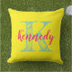 Grote kleurrijke familienaam monogram geel in de openlucht Pillow. (20 x 20 inch) gepersonaliseerde kussens, monogrammed met jouw naam en initiaal letter. Aangepaste tekst en kleuren. Het rendy ontwerp van de sjabloon van het borstelmanuscript typografie. Een idee van een deuropening voor de tuin, het pooldek of de veranda. Maak je eigen decoraties voor zitgebied, meerhuis, strandhuis, zomervakantie, boot, jacht enz. Handlettertypeontwerp. Fun vrolijk helder design met roze en blauwgroen kleuren. Verkrijgbaar in standaard- en grote afmetingen. Ook beschikbaar als binnenkussen.