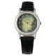 Een horloge met een afbeelding van een oceaanparadijs. Een rotsachtige grotingang hoog in de bergen met uitzicht op een prachtige oceaan waar vogels samen vliegen.