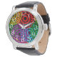 Dit horloge van mannen heeft een ontwerp van de Zwarte Geschiedenis van grote cirkels die uit regendruppels en cirkels in rood, geel, paars, groen, en turquoise worden gevormd.