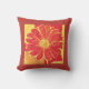 Kussen in een retro modern grafisch afbeelding van een grote madeliefjesbloem, in levendig rood en goudgeel, tegen een rode en saffraangele achtergrond, en omzoomd in dieprood