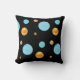 Mooi werpkussen met grote gouden en turquoise stippen op zwarte achtergrond.