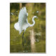 Een grote witte grot met vleugels die staan in een ondiepe rivier die een vis stalkt. De reflectie van de vogel wordt gezien in de nog steeds kalme wateren.