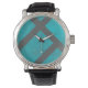 Grunged aqua blauw of turquoise en grijs minimalistisch design mannen polshorloge. met een stijl zwart lederen band.
