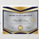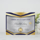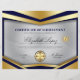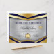 Dit professionele bewijs van prestatietoekenning is blauw en goud, en een grijze gedetailleerde achtergrond. Omvat twee onderscheidingen voor medailles: een maatse gouden en blauwe medaille onderaan met blauwe sterren en een gouden medaille.
