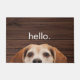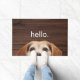 Welkom je gasten bij je thuis met een grappige foto van JoDog de glimlende Beagle die je bespioneert en het simpele woord "hallo." op een donkere houtachtergrond. Geweldig geschenk voor de hond of het dierenvriend of als cadeau voor het huishouden. Foto van JoDog en design © van TK Goforth, alle rechten voorbehouden.
