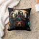 Drie speelse beren met heksenmakerij poseren tegen een gloeiende pet, met een spookachtige kasteelachtergrond, die de essentie van Halloween-festiviteiten vastlegt.