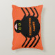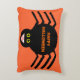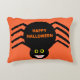 Deze geweldige kussen hebben een zwarte spin met acht harige benen, gele ogen met grote zwarte pupillen en een open mond met hun vingers. Er is oranje tekst die "Happy Halloween" en een overeenkomende oranje achtergrond leest.