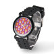 Dit geweldige horloge heeft een schattig, klein, wit spook met zwarte ogen en een open zwarte mond. Elke spook zit op of een oranje gekleurd vierkant of een paars gekleurd vierkant en er is of oranje of paarse tekst in elk vierkant dat Boo zegt! Het resultaat is een patroon van kwadraten en geesten.