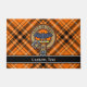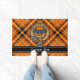 Halloween crest badge met vliegende vleermuis omgeven door een riem en sluiting over tartan background. Aangepaste tekst.
