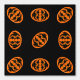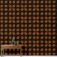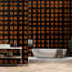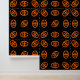 Dit geweldige behang heeft een oranje ovaal met zes kraaien erin. Elke kraai heeft gele ogen met zwarte pupillen en uitgestrekte vleugels. De kraaien vliegen naar elkaar toe en vormen een ovale vorm. De achtergrond is zwart.