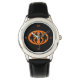 Dit geweldige horloge heeft een oranje ovaal met zes kraaien erin. Elke kraai heeft gele ogen met zwarte pupillen en uitgestrekte vleugels. De kraaien vliegen naar elkaar toe en vormen een ovale vorm. De achtergrond is zwart.
