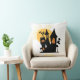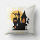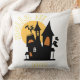 Een griezelig, oud herenhuis gehuld in nevel met gloeiende ramen en een volle maan op de achtergrond