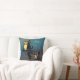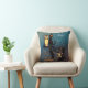 Een blauw en paarse Halloween "Naughty or Nice" gooi kussen met een zwarte kat en uil zitten op een boomtak 's nachts.