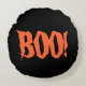 Ronde kussen in zwart en oranje met Halloween Boo. Pas dit object aan of koop zoals het is.