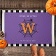 Halloween Spider Web Trick or treat Monogram deurmat met paarse achtergrond. Trick or treat! Vier de engste nacht van het jaar met dit spinnenweb, spin en monogram initiaal ontwerp in zwart, wit en sinaasappel. Met tekst "Trick or treat" die kan worden gewijzigd in uw gewenste offerte. Tekst klaar om aan te passen met jouw naam en Initiaal.