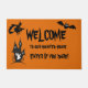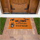 Halloween spookhuis deur mat, zegt "welkom in ons spookhuis, voer als je durft." Versierd met een spookhuis, vleermuis, spook en vliegende heks met oranje achtergrond! Deze deurmat is perfect voor de deur naar een Halloween Party!