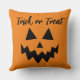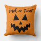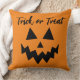 Het perfecte Halloween sierkussen met een Jack o Lantern pompoengezicht in het zwart op een oranje achtergrond, met de woorden "trick or treat" op de bovenkant.