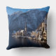 Foto gooit het kussen van het kussen met de stad Hallstatt, bedekt met sneeuw aan de kant van het meer van de Hallstätter See met Alpen-bergen op de achtergrond in het eerste licht van de zonsopgang in een winterlandschap in Oostenrijk.