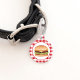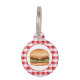 Destei's illustratie van een hamburger met een sesamzaadbroodje dat gevuld is met kaas, sla, rundvlees, tomaat, ketchup en augurken. Aan de andere kant zijn er twee personaliseerbare tekstgebieden waar de ene ideaal is voor de naam van het huisdier, terwijl de andere kan worden gebruikt voor het telefoonnummer van de eigenaar.