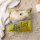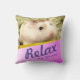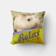 Fun en schattig hamsterkussen. Afbeelding met een schattige bruine en witte robo hamster. Ze heeft een schattige roze neus en lange witte whiskers. De kussen hebben een bericht "Relax and Be Happy". De kleurrijke gele en roze geometrische design geven de kussen een extra helder uiterlijk.