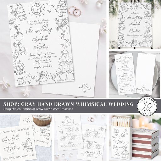 Europese geïnspireerde grijze handgetekende eigenzinnige schetsen grillige bruiloft uitnodiging. Perfect voor koppels die op zoek zijn naar een creatieve, luchtige touch met een Europese flair, dit speelse ontwerp onderscheidt zich door een dynamische opstelling van grote handgetekende illustraties rond de tekst en vloeiend van de randen voor een artistieke en moderne look. Het ontwerp is vormgegeven in een verfijnd grijs palet en straalt een gevoel van persoonlijke charme uit, terwijl het een elegant Europees tintje behoudt. Het ontwerp is voorzien van grillige schetsen van bruiloftselementen, waaronder een sprankelende discobal, trouwklokken, een camera, een champagnetoren, harten, een gelaagde taart, bloemen en een "Just Married" -auto. Deze eigenzinnige doodles brengen een leuke, zorgeloze sfeer op de uitnodiging met behoud van de verfijnde esthetiek. Uw bruiloft details worden getoond in een mix van script en handgeschreven-stijl lettertypen, toe te voegen aan de ontspannen maar stijlvolle aantrekkingskracht. Volledig aanpasbaar, deze uitnodiging kunt u kleuren, tekst en lay-out aan te passen aan uw bruiloft visie. Dit unieke en gedenkwaardige ontwerp, digitaal gedrukt of gedeeld, is perfect om uw speciale dag met persoonlijkheid en charme aan te kondigen.