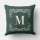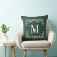 Dit monogram kerstkussen heeft handgetekend wit winterblad dat het monogram lijst. Het monogram en het lijst zijn wit op een donkergroene achtergrond.