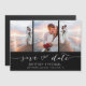 Kies de beste afbeeldingen uit je verloving-opname of je favoriete afbeeldingen van jullie twee voor deze perfecte bewaardatum. De woorden sparen de datum zijn handgeschreven om een persoonlijk gevoel aan de kaart te geven. De voorkant heeft 3 afbeeldingen en de achterkant heeft een groot afbeelding met een witte filter op de bovenkant.