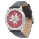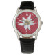 Een handig horloge met een afbeelding van één alpiene bloem van een Edelweiss op een rode achtergrond. Witte stippen en getallen versieren rond de buitenrand van het gezicht. Pas aan om het even welke tekst toe te voegen u wilt.