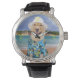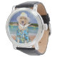 Een horloge met een 90 pond geel lab, in een Hawaïaans shirt, op een tropisch strand. Vier belangrijke posities worden gemarkeerd door losse tekens op te hangen. Dit zal je hopelijk overdag luchtig houden. U kunt de horlogeopties wijzigen. De achtergrond van het strand is een publieksdomein foto.