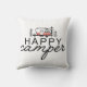 Een coole hand getekende illustratie voor avonturiers met een camper in het bos. De tekst luidt: Happy camper.