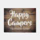 Fun, bijtend houten buitendeuropencadeau voor gepensioneerde paren, wandelaars, rivieren, kampeerders en natuur liefhebbers - Gepersonaliseerde, schuurhoutboomklep leest 'Happy Campers' in vette, handgeschreven sjabloon voor het weergeven van een familienaam (of een aangepaste tekst) hieronder in witte, elegante letters. Tegen een achtergrond van bijtende, oude houten planken. Ook een geweldig cadeau voor je pensioen. Zouden er perfect uitzien voor een RV of een luie blokhut om gasten welkom te heten.