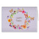 Vrolijk paaswenskaart met bloemen, vlinders en libellen.