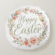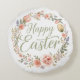 This Round Pillow features flowing "Happy Easter" calligraphy in soft sage green, beautifully adorned with delicate spring florals including tulips, cherry blossoms, and wildflowers in blush pink and lavender, making it ideal for women who appreciate sophisticated décor and expressing heartfelt Easter wishes with refined style.