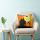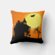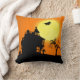 Happy Halloween-illustratie met een roekachtig zwart landschap met een eng huis, een griezelige boom, vleermuizen en een heks die op haar bruin vliegt; allemaal op een oranje achtergrond met de volle glans.
