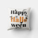 Happy Halloween typografie met elementen gooien kussen. Het toont de tekst "Happy Halloween" in zwart-oranje typografie, elementen zoals een spin, een heks, vleermuizen, een zwarte kat, maansikkel en bewerkbaar jaar.