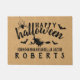 Klassieke en elegante halloween doormat voor herfst - "Happy Halloween" tekst met vleermuizen, een vliegende heks, een spin en je familienaam