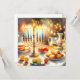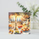 Hanukkah waterverf illustratie. Een prachtig ingerichte tafel voor een feestelijke viering, met een traditionele menora met aangestoken kaarsen. Zacht, warm licht, terwijl vakantiedecoraties een vleugje vrolijkheid toevoegen. Warme lichten creëren een gezellige, uitnodigende sfeer.