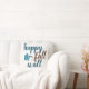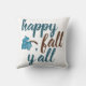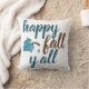 Kute Herfst gooit kussen! Moderne scripttypografie citaat in blauwgroen en bruin zegt "happy herfst y'all" naast een zoet blauw vallend blad. Eenvoudige witte achtergrond. Geweldig voor de herfst!