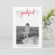 Vier het seizoen van dankbaarheid met deze moderne Thanksgiving fotokaart met gedurfde "dankbare" typografie en uw favoriete familiefoto. Het strakke minimalistische ontwerp is perfect voor het verzenden van warme vakantiewensen naar vrienden en geliefden. Pas aan met uw familienaam en jaar voor een persoonlijk tintje. Een stijlvolle keuze voor gezinnen die houden van een eenvoudige, moderne esthetiek. Ideaal voor Thanksgiving begroetingen, vakantie foto kaarten, of herfst familie updates.