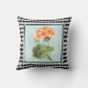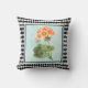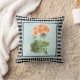 werpkussens zijn voorzien van een botanische afbeelding met een Geraniumbloem op een dichte denimachtergrond met een zwart-wit harlequin lijst.