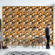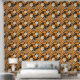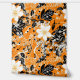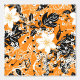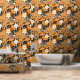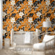 Een naadloos patroon met grote witte bloemen, kleine witte bloemen, zwarte bladeren en kleine zwarte muzieknoten op een oranje achtergrond. Het ontwerp heeft een handgeschilderde uitstraling, waarbij bloemelementen met muzikale motieven worden gecombineerd tot een harmonieuze en artistieke creëer.