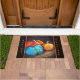 Three colorful pumpkins sitting on a bale of hay are the focal point of this lovely door mat. Harvest Blessings is the perfect sentiment to greet your holiday guests with!