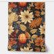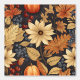 Een levendige herfstcompositie met grote zonnebloemen, levendige oranje pompoenen en rijk gebladerte van herfst. Diepblauwe bessen en rode accenten voegen contrast toe tegen de donkere achtergrond, waardoor de gedurfde tinten van geel, sinaasappel en bruine bladeren worden benadrukt. Het ontwerp legt de essentie van een overvloedig oogstseizoen vast, waarbij natuurlijke elementen worden gemengd in een harmonieus, seizoensgebonden tapijt.