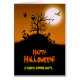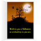 Een eng gehaunde gradertuin met een uil in een spookkige boom die ook een kloosterstrook van een kater heeft. De achtergrond is een oranje hemel en er is een volle maan met vleermuizen die er over vliegen. Heel leuk en eng ontwerp voor je Halloween wenskaart.