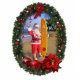 De kerstman met surfplank op het strand, omgeven door een kerstak.