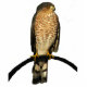 Dit zal een typisch kerstboomornament maken. Een Sharp-Shinned Hawk is doordrenkt in de hoop een maaltijd te vangen. Hij heeft een jager's stare. Zijn gele talonen en oranje ogen zijn prominent. Hij heeft mooie roestbanden en roombanden op zijn borst, witte en zwarte gestreepte staartveren, en een grijze achterkant.