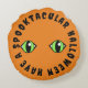 Dit ronde kussen heeft een vakantiebericht voor uw gasten. Het centrum heeft groene ogen en de boodschap, in het sinaasappel, luidt "Have A Spooktacular Halloween". De achterkant is oranje, met zwarte tekst.