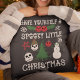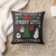 Dit heerlijk griezelige vakantiekussen biedt een gothic-stijl spin op de traditionele kerstmotieven met sneeuwvlokken en stervormen gevormd uit witte skeletten botten, schedelvormige kerstversieringen en hulstbessen, griezelige kerstkransen en -bomen en ghoulish ornamenten en sneeuwpoppen. Mijn illustraties in groen, grijs, rood en wit staan op een zwarte achtergrond. Mijn graphics begeleiden de slogan HAVE SELF A SPOOKY LITTLE CHRISTMAS gespeld in benauwde witte schedel en botvormige letters. De achterkant heeft een coördinerend spookachtig kerstpatroon.