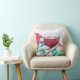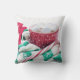 Een feestelijk kussen met een warme kerstfoto. Een warme beker cacao met marshmallows in een schattige mok van rode en witte polka stip. Een gestreept snoepriet rust op een groene en witte gestreepte sjaal met sneeuw. Sommige rode handschoenen rusten op de top en zijn ook bedekt met sneeuw. Ahhh, een warme drink na het binnenkomen van de kou raakt echt de plek. Een feestelijke foto.